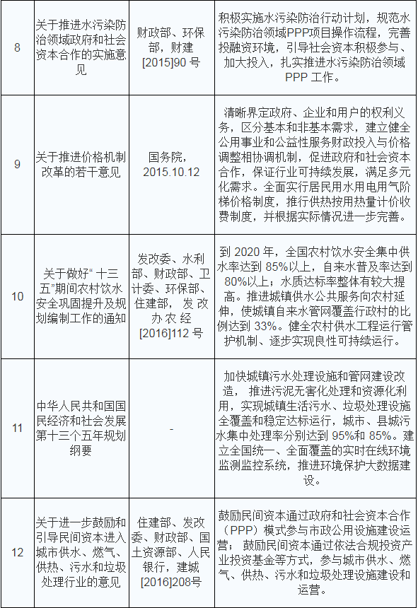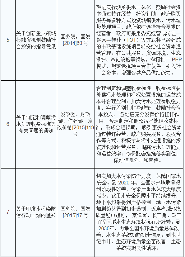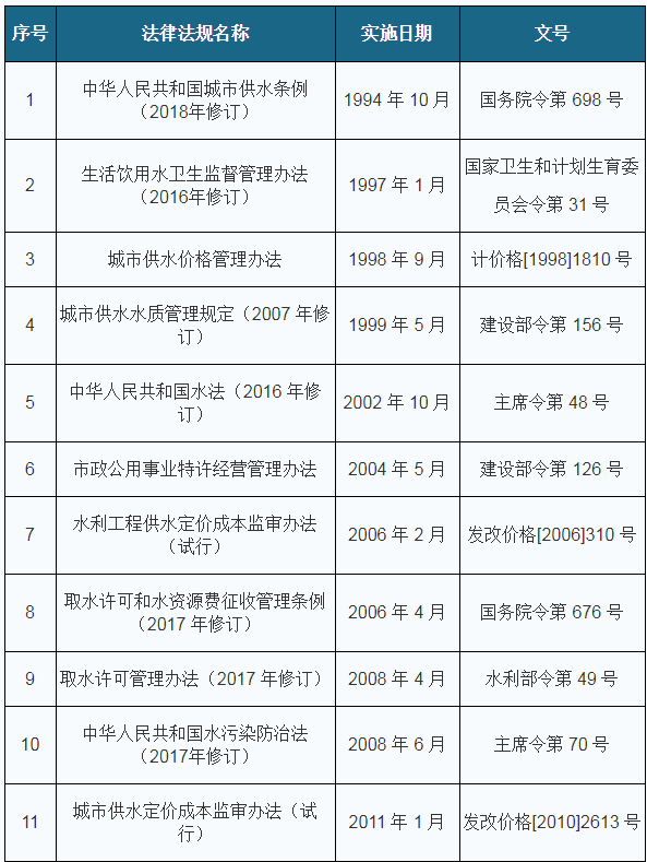 国家有关部门制定了一系列水务行业的法律、法规和政策等规范性文件,涉及运营资质、运行质量、项目建设标准、价格管理、供排水标准等诸多方面。水务行业相关的主要法律法规、政策如下: