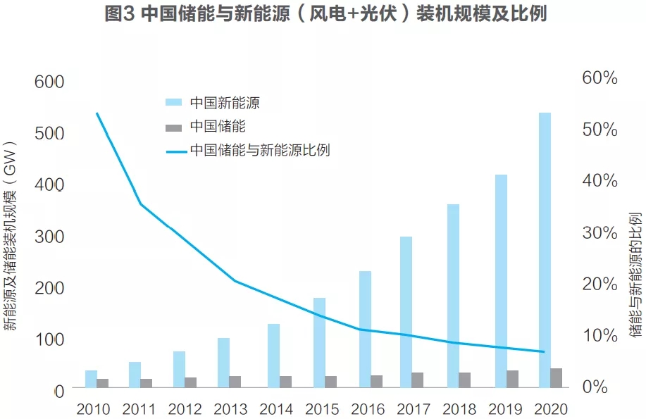 储能与新能源装机规模的比例(简称“储新比”)在2015年之前快速下降,在该阶段储能(抽水蓄能)主要服务于传统能源发电的调频调峰服务,与新能源发电的关联性不大。2015年之后储新比数值下降幅度趋缓,国际和国内市场呈现了相同的趋势(图1~图3)。虽然最近几年储能产业的发展得到各国重视,保持了良好的发展态势,但同时,风电和光伏发电也在近几年得到快速发展,因此总体而言,储能产业的发展步伐仍然落后于新能源产业的发展,储新比呈现下降趋势。