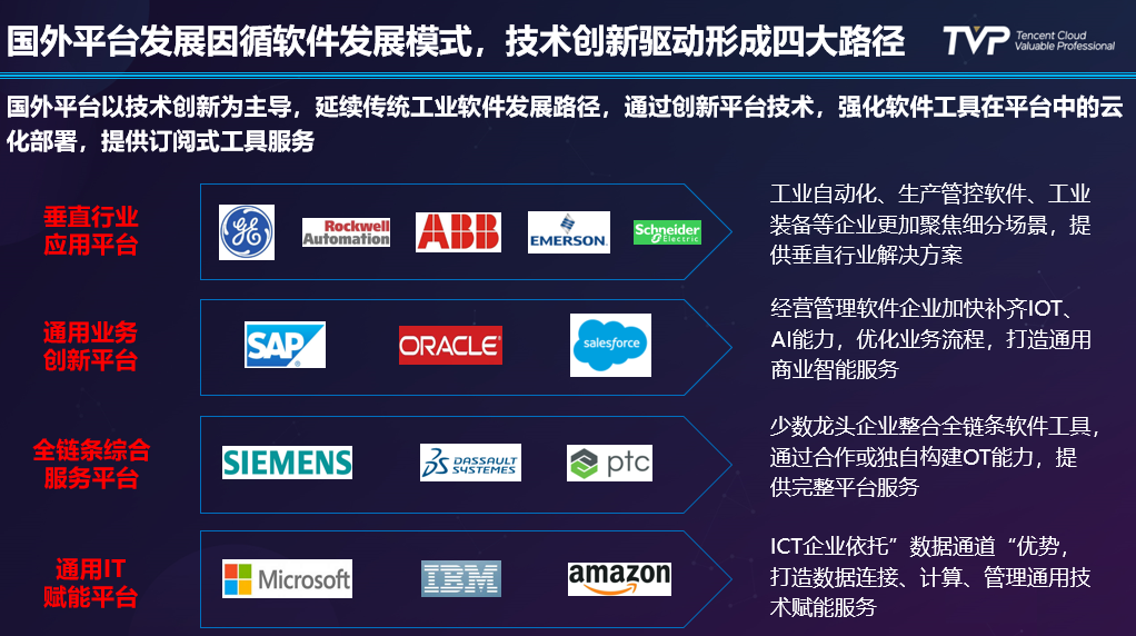 通用IT赋能平台:如微软、亚马逊等,它们的产品原型最早是IaaS、PaaS等。在未来,随着技术水平的提升,更会不断强调对底层数据接入的能力和上层的生态构建。