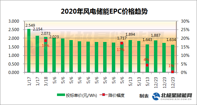 据北极星储能网统计,2020年截至目前共有五个风电储能项目公示中标价格,风电储能中标单价从1月份的最高2.549元/Wh、降至了目前最低1.634元/Wh,一年内降幅达35.9%。