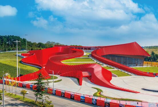 “红飘带”项目作为长征国家文化公园重点项目,是贵州重点建设区的标志性、引领性工程,也是贵州推进长征国家文化公园建设的重要抓手和破题之举。该项目在建筑理念上,以“地球的红飘带”为建筑核心语言,建筑形体设计以“中央红军长征路线图”作为主题,打造了南北方向蜿蜒的红飘带曲面幕墙的曲率跌宕起伏,形成了连续转折的动态轮廓,体现了“红旗飘飘”的灵动之美。“红飘带”外立面色彩系统采用跳色设计,创意设计融合贵州赤水丹霞地貌,实现了建筑与自然景观的有机结合,展现出不同的视觉及空间效果。