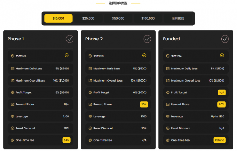 •低门槛方案:选择WeMasterTrade“评估挑战”账户,仅需45美元起即可参与(价格随促销活动而变化,以官网公示为准),通过技能评估和稳定性评估两阶段考核后,可获得10000美元虚拟资本,您无需投入大额本金,还有机会获得90%交易绩效分成,真正实现用能力换收益;