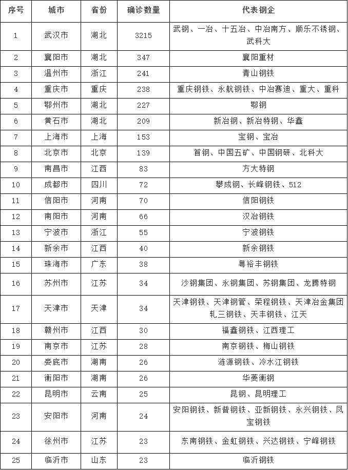 疫情防控形势严峻,钢铁行业企业人员密集,绝大多数长流程钢企没有停产,形势更加严峻!1月31日,“钢都”鞍山市确认1例输入性新型冠状病毒感染的肺炎确诊病例,目前,大多数钢厂所在地都已确诊心肺病例,小编对各大钢企分布的地区确诊病例进行了统计,希望钢企以及和钢企有业务来往的朋友警惕、做好疫情防护工作!