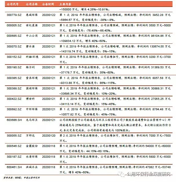 值得注意的是,发布预告的公司多数参与了PPP项目尤其是水务工程类PPP,且在2018年这些公司的业绩受金融去杠杆和PPP清库的影响较大。主要体现在大量在手项目由于融资问题进度停滞不前,公司现金流得不到支持,财务成本不断提高,形成恶性循环。2019年环保公司通过引入国资、转变业务结构、出清劣质项目等方式自救,行业处于洗牌期。从目前公布的业绩预告看,2019年底环保行业这一轮的大洗牌已初见分晓。