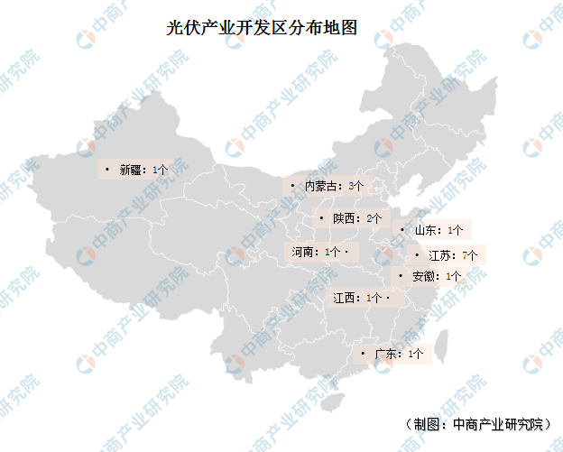 为了更全面的了解我国光伏产业发展现状,中商产业研究院梳理出国内光伏产业开发区18个。据不完全统计,国内光伏产业开发区主要分布在东部沿海地区、西北地区、中部地区的省份。按开发区数量来看,拥有光伏产业开发区数量最多的省市为江苏省,开发区数量达7个;其次为内蒙古,光伏产业开发区共3个;陕西拥有光伏产业开发区2个;江西、安徽、新疆、广东、山东以及河南各一个。