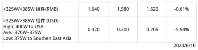 供应链环节中,本周还是组件的价格市场呈现微幅下行的状态。依据近期中国市场项目中标价格来看,组件报价整体持续走低,随着630项目准备接近尾声,订单能见度低,市场需求可能短暂面临需求空窗期,为维持企业的开工率,部分企业持续用低价抢单,导致市场的报价竞争激烈,单多晶价格持续走跌。目前275W-280W 、>325W/>385W组件均价分别小幅下调至1.390元/W和1.620元/W。值得注意的是,现阶段光伏玻璃龙头分别推迟复产、新产线投产时间,部分供给较为紧缺的双玻产品已有尝试性涨价苗头。海外方面,目前美国欧洲继续解封,而印度、南美疫情仍在快速发展,整体市场复工进度较为审慎,需求不足令供应链价格进一步下探,目前305W-310W 组件均价降至0.26美元/W,而>325W/>385W 组件海外价格较上周降幅超过5%,均价降至0.206美元/W。