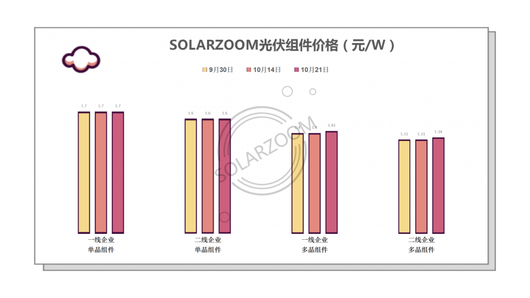 EVA、玻璃等辅材价格持续大幅上涨且市场限量供应的情况下,国内组件价格得到较强的支撑,单晶组件报价坚挺在1.6元/W以上,部分厂商开始有涨价意愿;多晶组件价格相对灵活,目前市场高位价格到1.45元/W。目前光伏组件整体需求旺盛,国内户用最后期限内抢装积极,年内竞电价项目陆续开工安装,国内主流厂商目前订单需求较满,正在洽谈明年的订单。但近期辅材辅料缺货价格飙涨,后期能否缓解也是给明年新订单的落地增加了不确定性。