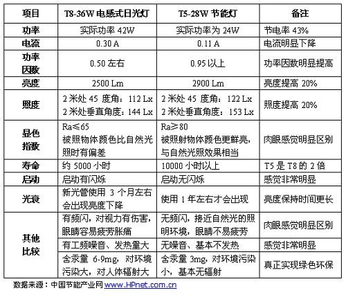 T5节能灯与T8日光灯性能比较: