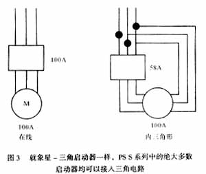 PS S系列中绝大部分启动器都可以与电动机的三角形电路连接,其结果就象一个星-三角启动器(图3),称之为“内三角”连接。这种连接可使软启动器的电流负荷降低 ,从而使电流控制范围扩大至515A,可以满足任何较小的应用设备,并能够为用户节约更多的空间和金钱。