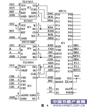 TLC0834是4路8位A/D转换器,采集1路电压和3路电流信号;TLC5615是10位串行D/A,将控制量变为模拟电压信号,去控制可控硅交流调压;X25045是含WDT和EEPROM的多功能电路,负责单片机系统的安全监视和重要参数的保护;SN75176是RS485接口,实现连网监控。