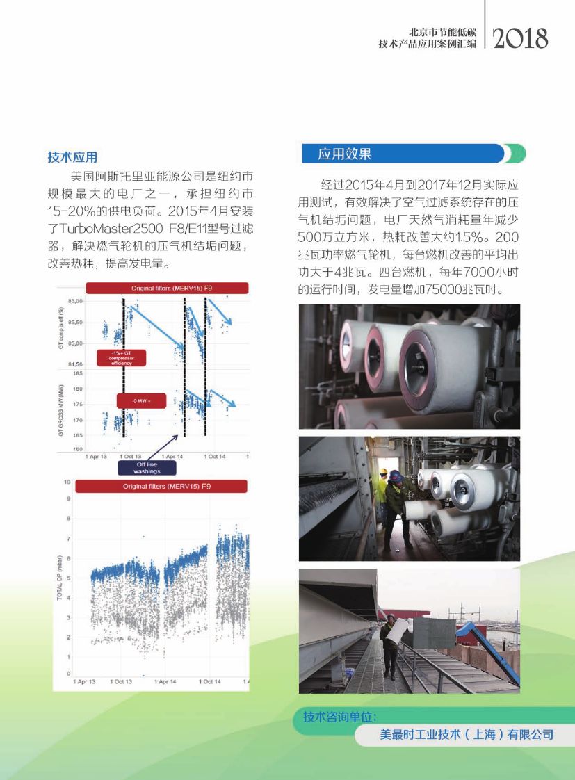 燃气轮机高效空气进气过滤系统技术将室外空气通过燃气轮机空气净化室的三级高效过滤器实现空气净化,达到燃气轮机空气净化要求,比传统高效过滤器净化程度高,降低了维护成本, 并保证压气机等熵效率年下降0.5%范围内,有效提高燃气轮机发电效率。