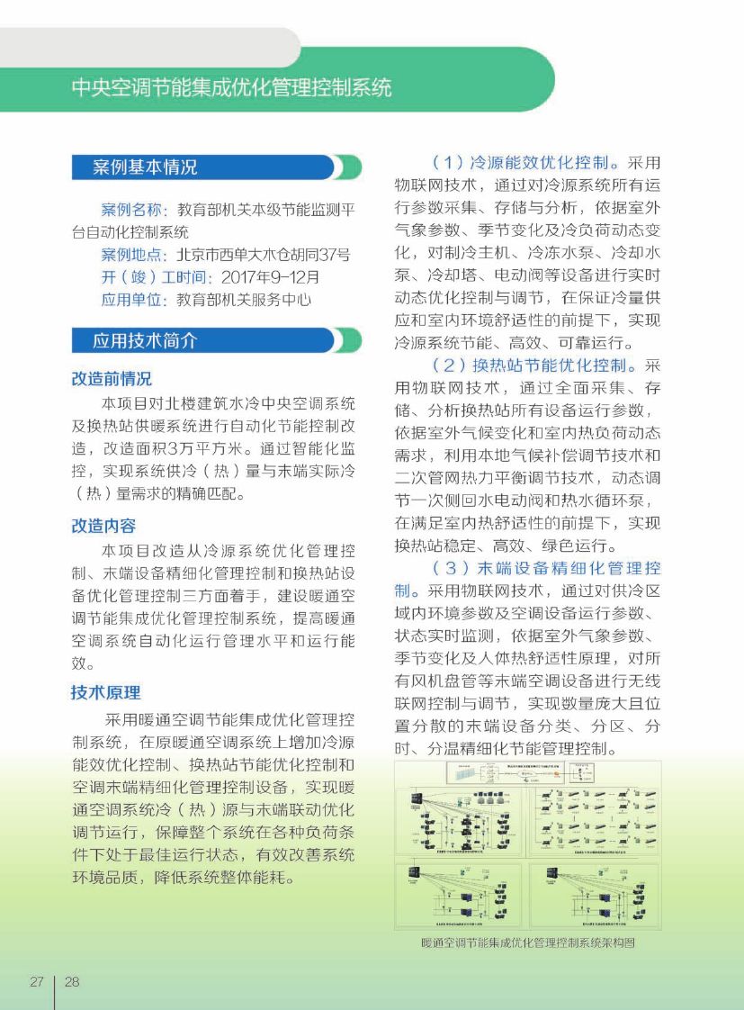 该技术采用物联网技术,根据室外气象情况及空调冷负荷变化,对制冷主机、冷冻水泵、冷却水泵、冷却塔、各类阀门进行优化控制与调节,保障冷量按需供应;对空调机、风机盘管和新风机等位置分散的空调设备进行管理控制满足末端舒适性,通过对空调冷源优化控制、末端集中监控与管理,实现系统高效运行,空调节能率达15%-30%。