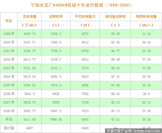 该项目于1996年10月开工建设到1998年2月建成投产运行。自投产以来,经过十年多的运行,已经取得良好的示范效果。机组的设计发电能力为6480KW,实际已经稳定在7200kW,设计年发电量4087万kWh,2008年实际已经达到5666万kWh,设计吨熟料发电量33.07kWh,2008年实际达到37.26kWh。